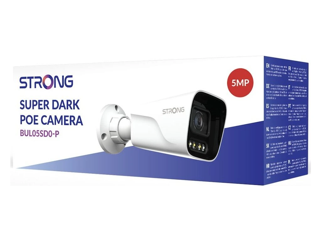5megapixelová IP kamera typu bullet nabízí snímač CMOS, rozlišení 2880 × 1620 obrazových bodů a úhel záběru diagonálně 112°. Video ve vysoké kvalitě zaručí také při nočních záběrech díky LED přísvitu do vzdálenosti 15 m. Připojení lze jednoduše realizovat pomocí RJ-45 portu. Díky aplikaci Vision by STRONG lze sledovat dění 24 hodin denně 7 dní v týdnu odkudkoli skrze váš smartphone. Kamera je navíc odolná vůči nepříznivým vlivům počasí dle certifikace IP67.