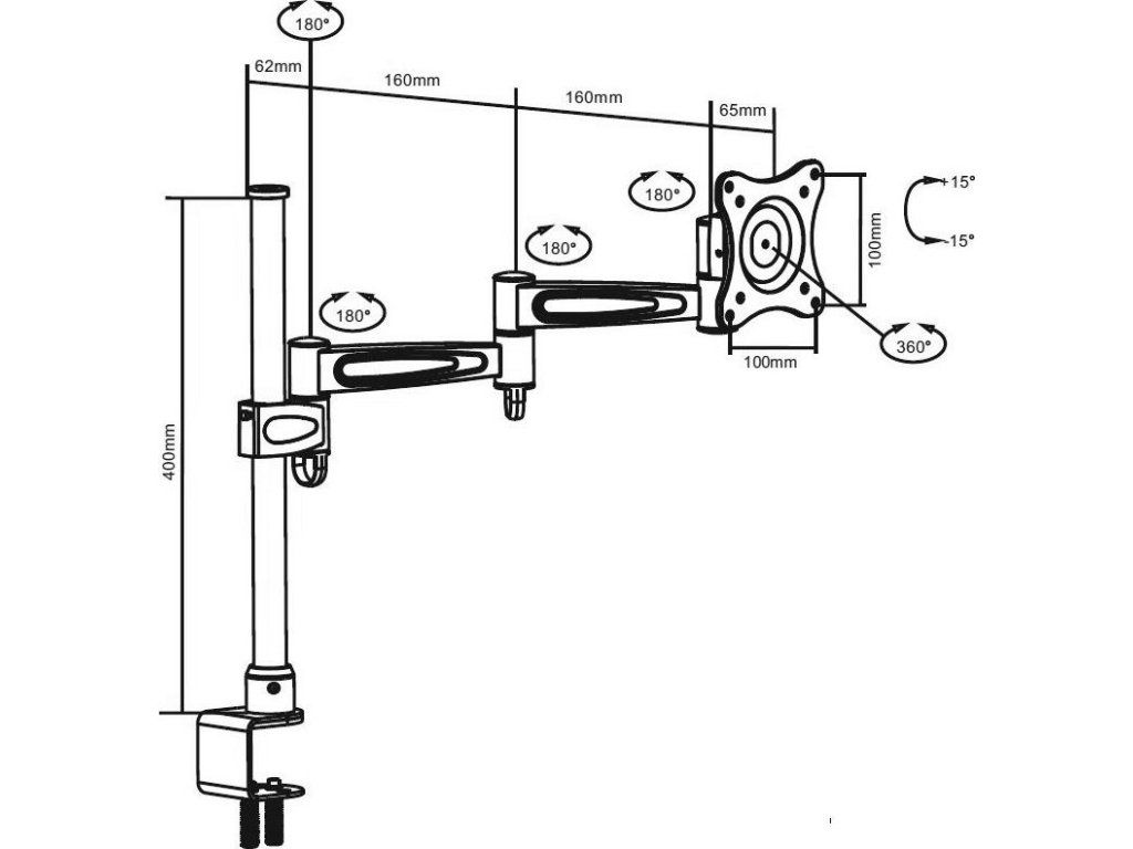 Sunne by Elite Screens LCD-B13Držák na stůl pro montáž monitorů a TV s úhlopříčkou 13" až 27". Maximální zatížení tohoto držáku je 15 kg. Držák dovoluje náklon 15°, otočení 180° a Pivot 360°. Upevnění držáku je možné na pracovní desku s tloušťkou v rozmezí 15–47 mm. Rameno dosahuje délky 439 mm.