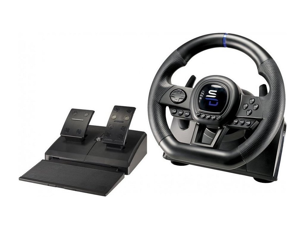 Volant s pedály SUPERDRIVE SV650 kompatibilní s herními konzolemi PlayStation (PS4, PS3), Xbox (One, X/S), Nintendo Switch nebo počítači. Díky své univerzálnosti si na realistické zážitky z jízdy užijete takřka na jakékoli platformě. Volant se vyznačuje na pohled elegantním designem a díky zvolené struktuře se pohodlně a pevně drží.