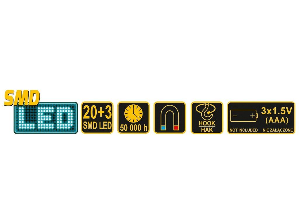 Napájení 3x AAA baterie (LR03, nejsou součástí balení). Svítilnu lze snadno upevnit vestavěným magnetem ve výklopném držáku, nebo zavěsit na zabudovaný výklopný háček.