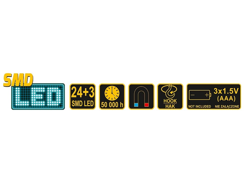 Poskytuje dva režimy světla - stálé bílé rozptylové světlo 24x LED a stálé bílé bodové světlo 3x LED.