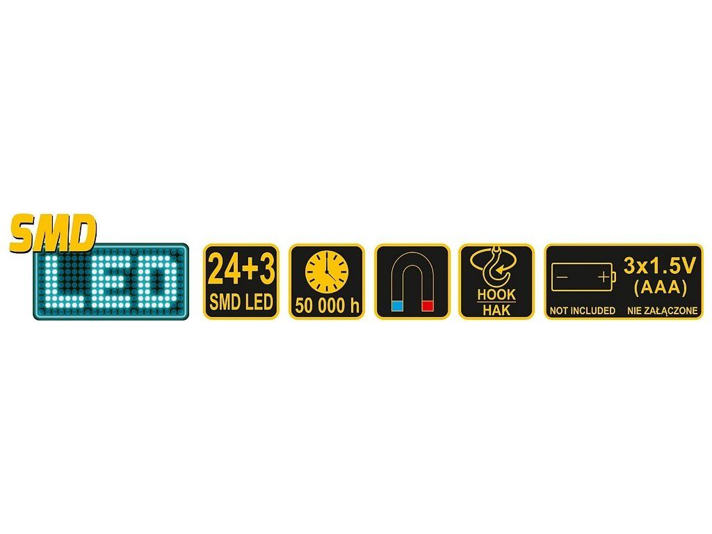 Napájení 3x AAA baterie (LR03, nejsou součástí balení). Svítilnu lze snadno upevnit vestavěným magnetem na zadní straně, nebo zavěsit na zabudovaný výklopný háček.