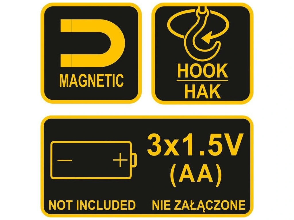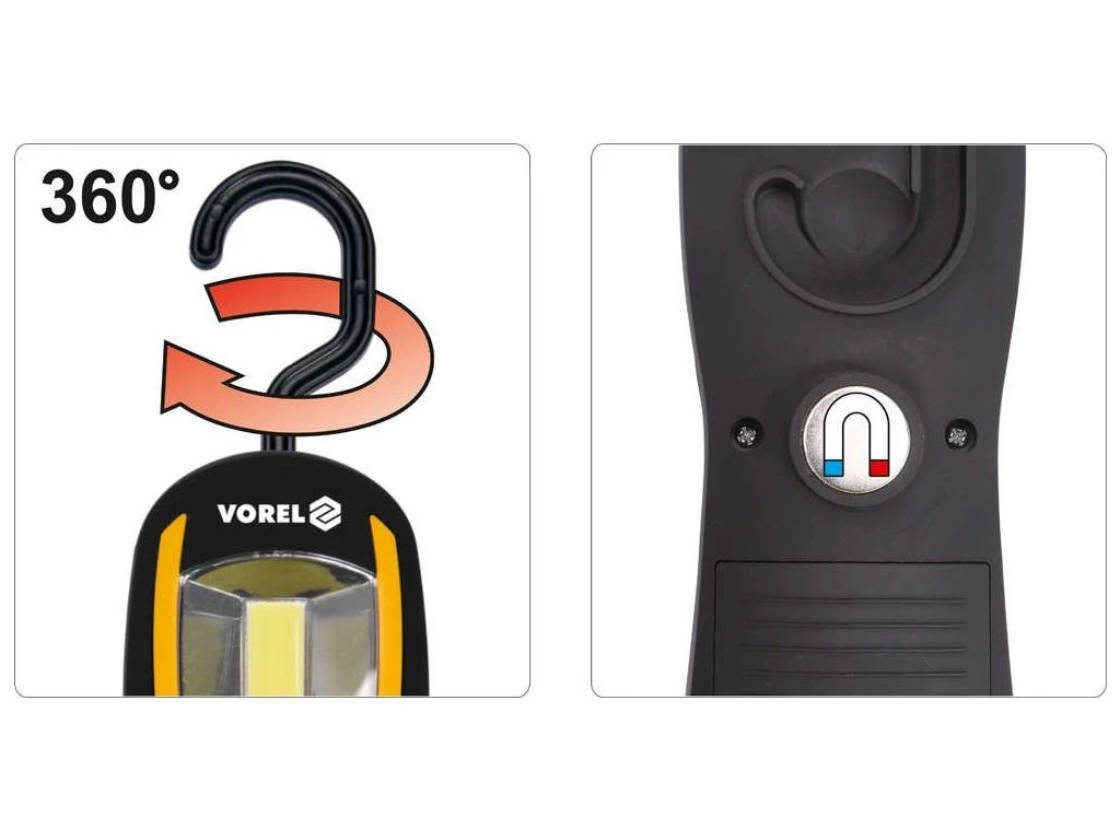 Ruční lampa je vybavená moderní COB LED poskytující pevný, rozptýlený paprsek světla. Svítidlo má na zadní straně krytu magnet a otočný háček. Svítilna je napájena bateriemi 3xAA, které nejsou součástí sady.