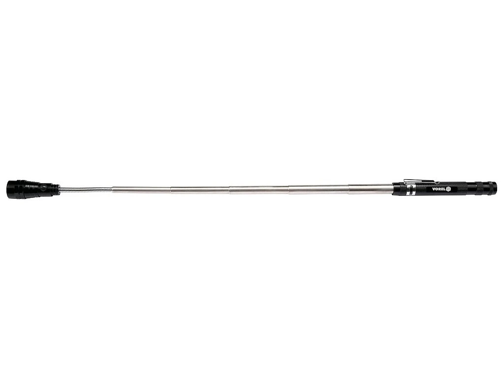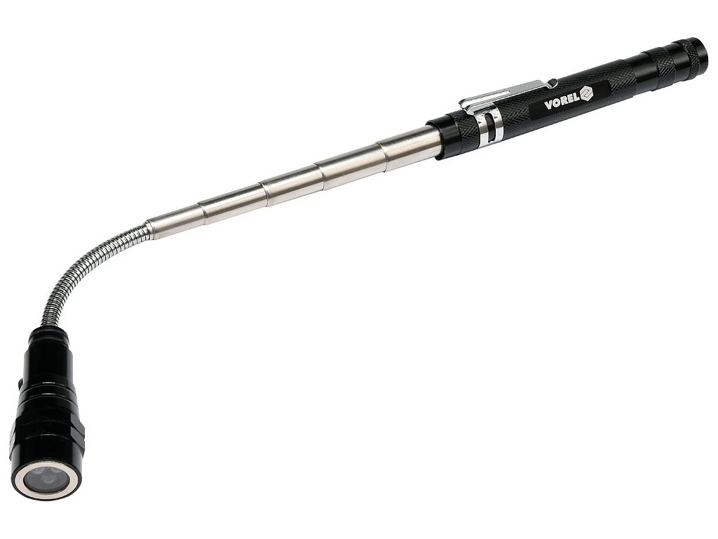 Celokovová teleskopická LED svítilna, s klipsem na opasek a s magnetem pro opevnění. Svítilna je v místě LED diod osazena magnetickým kroužkem, díky kterému lze snadno vytáhnout kovové předměty (např. šroubky) i z nepřístupných míst.