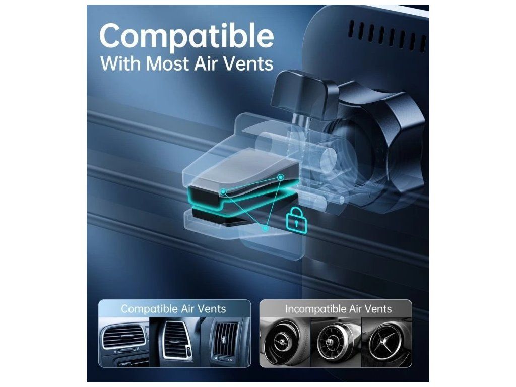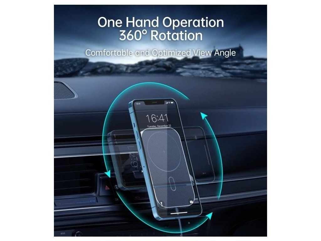 SWISSTEN MagSafe držák do ventilace 15 WMagnetický držák a bezdrátová nabíječka v jednom s uchycením do ventilace auta. Čelisti držáku jsou opatřeny gumou, díky které nedojde k poškození mřížky ventilátoru. Umožňuje bezdrátové MagSafe nabíjení, to je určeno pro majitele iPhone 12 (a vyšších řad), přičemž sada magnetů dokonale zarovná iPhone s nabíječkou a nabíjení je tak maximálně efektivní. Tento magnetický držák se ale díky kompatibilitě s nabíjením Qi dá používat také k bezdrátovému nabíjení iPhone 8 a novějších modelů – a to s výkonem až 15 W. Vhodnou pozici v rozsahu 360° lze navíc zafixovat speciální šroubem na zadní straně držáku.