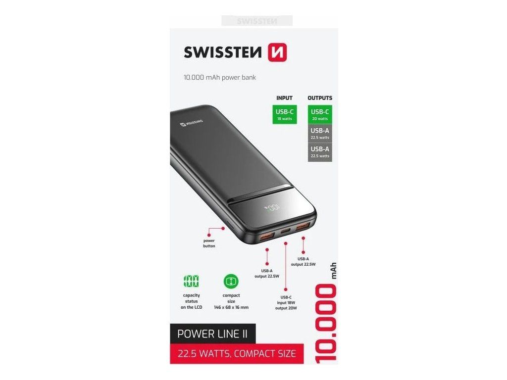 Powerbanka SWISSTEN POWER LINE II 10 000 mAh je spolehlivý zdroj energie pro vaše zařízení na cestách. Kompaktní a lehké provedení umožní snadné přenášení v tašce, batohu nebo v ruce. V rámci domova můžete nabíjet své zařízení třeba z postele, abyste pak nemuseli vstávat. Hlavní uplatnění však najde u milovníků cestování, dobrodružství a přírody. Vždy, když vyrazíte do kempu, na výlet do lesa nebo na víkendový festival, plně nabitá baterie se vždy hodí. Powerbanka SWISSTEN POWER LINE II disponuje kapacitou 10 000 mAh, která je dostatečná pro nabití smartphonu, tabletu nebo drobné nositelné elektroniky – fitness náramku, sluchátek, chytrých hodinek apod.