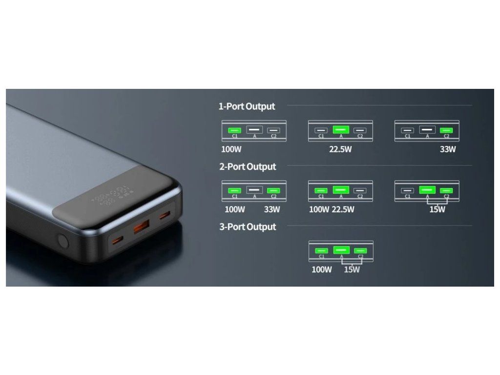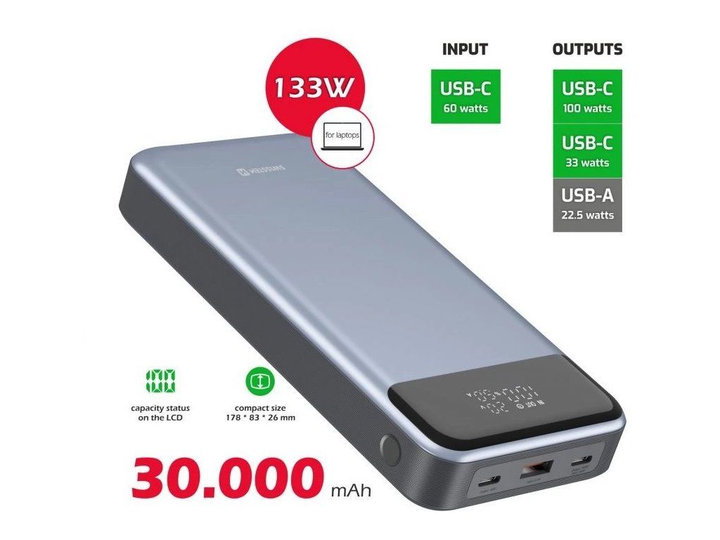 Powerbanka v elegantním provedení s kapacitou 30 000 mAh nabízí dva USB-C a jeden USB port pro nabíjení až tří zařízení současně. Maximální výstupní výkon až 133 W umožňuje nabíjení všech vašich zařízení, včetně notebooků. Zároveň podporuje vstupní výkon až 60 W, což výrazně zkrátí dobu potřebnou k jejímu nabití. Porty podporují oba nejvyužívanější formáty rychlonabíjení Power Delivery i Qualcomm Quick Charge. Potěší také praktický LCD displej zobrazující aktuální stav nabití.