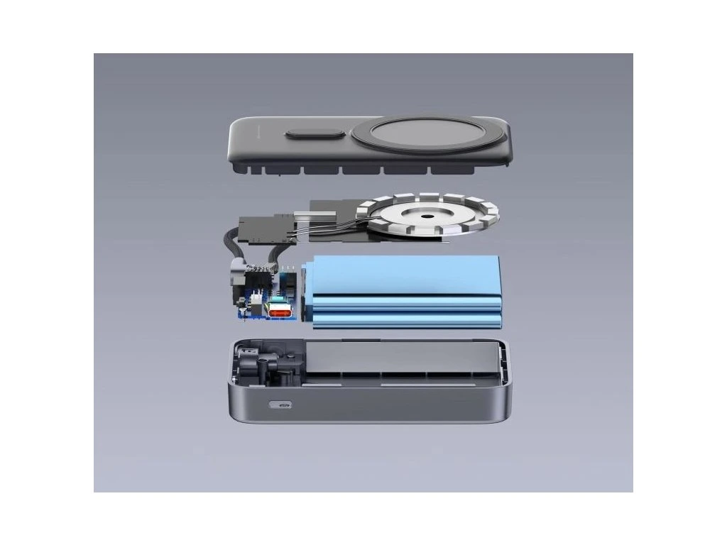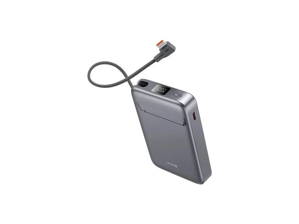 Součástí těla powerbanky je praktický 15cm USB-C kabel, který máte vždy po ruce, a výklopný stojánek umožňující pohodlné sledování obrazovky během nabíjení. Přehledný digitální LED displej zobrazuje zbývající kapacitu v procentech i indikaci rychlého nabíjení. Konstrukce z ohnivzdorného ABS a polykarbonátu zajišťuje bezpečný provoz s ochranou proti přepětí, přehřátí, přetížení, přebití i zkratu.