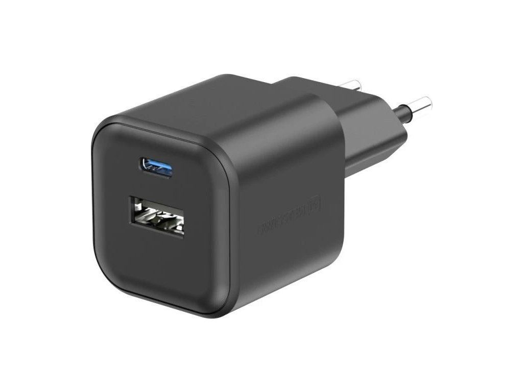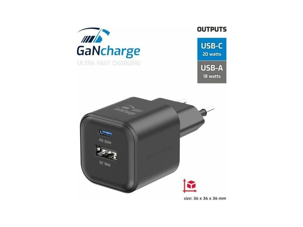 SWISSTEN GaN 1× USB-C PD 20 W + 1× USB QC 18 WUniverzální napájecí adaptér nabízející jeden konektor USB-C s výkonem až 20 W a jeden konektor USB s výkonem až 18 W. Adaptér podporuje protokoly rychlého nabíjení Power Delivery a Quick Charge 3.0. Použitá GaN technologie snižuje tvorbu tepla, čímž zvyšuje účinnost nabíječky při zachování kompaktních rozměrů (přibližně 3,6 × 3,6 × 3,6 cm). Samozřejmostí je ochrana proti zkratování, přepětí, přetížení nabíjení a vysoké teplotě.