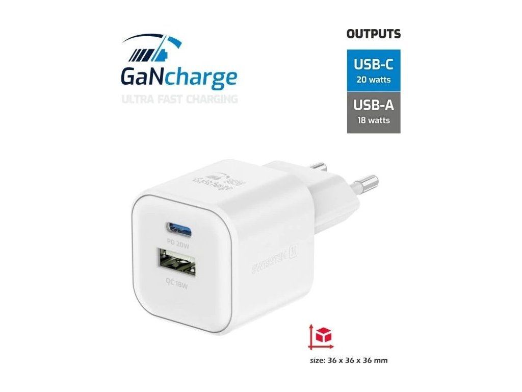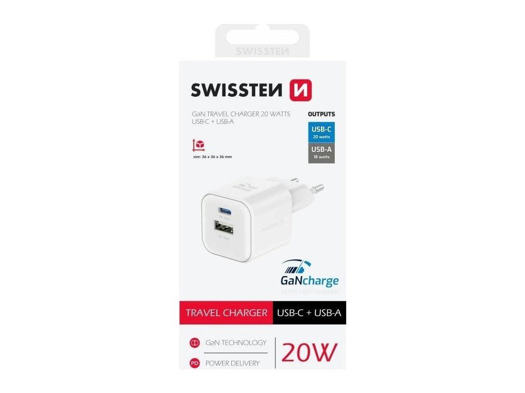 SWISSTEN GaN 1× USB-C PD 20 W + 1× USB QC 18 WUniverzální napájecí adaptér nabízející jeden konektor USB-C s výkonem až 20 W a jeden konektor USB s výkonem až 18 W. Adaptér podporuje protokoly rychlého nabíjení Power Delivery a Quick Charge 3.0. Použitá GaN technologie snižuje tvorbu tepla, čímž zvyšuje účinnost nabíječky při zachování kompaktních rozměrů (přibližně 3,6 × 3,6 × 3,6 cm). Samozřejmostí je ochrana proti zkratování, přepětí, přetížení nabíjení a vysoké teplotě.