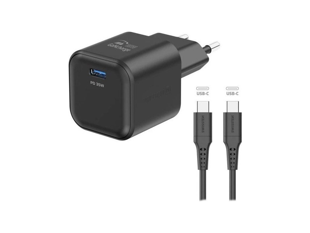 Swissten síťový adaptér gan 1x usb-c 35w power delivery černý + datový kabel usb-c/usb-c 1,2 m černý