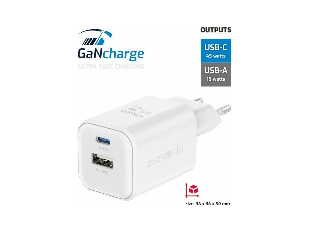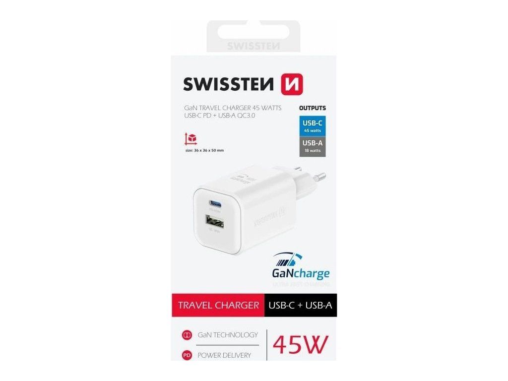SWISSTEN GaN 1× USB-C PD 45 W + 1× USB QC 18 WUniverzální napájecí adaptér s výkonem až 45 W. Pro nabíjení zařízení jsou k dispozici konektory USB a USB-C. Adaptér podporuje protokoly rychlého nabíjení Power Delivery a Quick Charge 3.0. Použitá GaN technologie snižuje tvorbu tepla, čímž zvyšuje účinnost nabíječky při zachování kompaktních rozměrů.