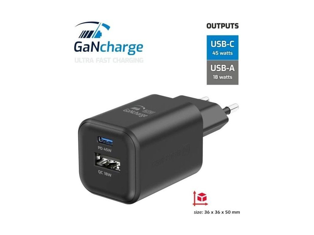 SWISSTEN GaN 1× USB-C PD 45 W + 1× USB QC 18 WUniverzální napájecí adaptér s výkonem až 45 W. Pro nabíjení zařízení jsou k dispozici konektory USB a USB-C. Adaptér podporuje protokoly rychlého nabíjení Power Delivery a Quick Charge 3.0. Použitá GaN technologie snižuje tvorbu tepla, čímž zvyšuje účinnost nabíječky při zachování kompaktních rozměrů.
