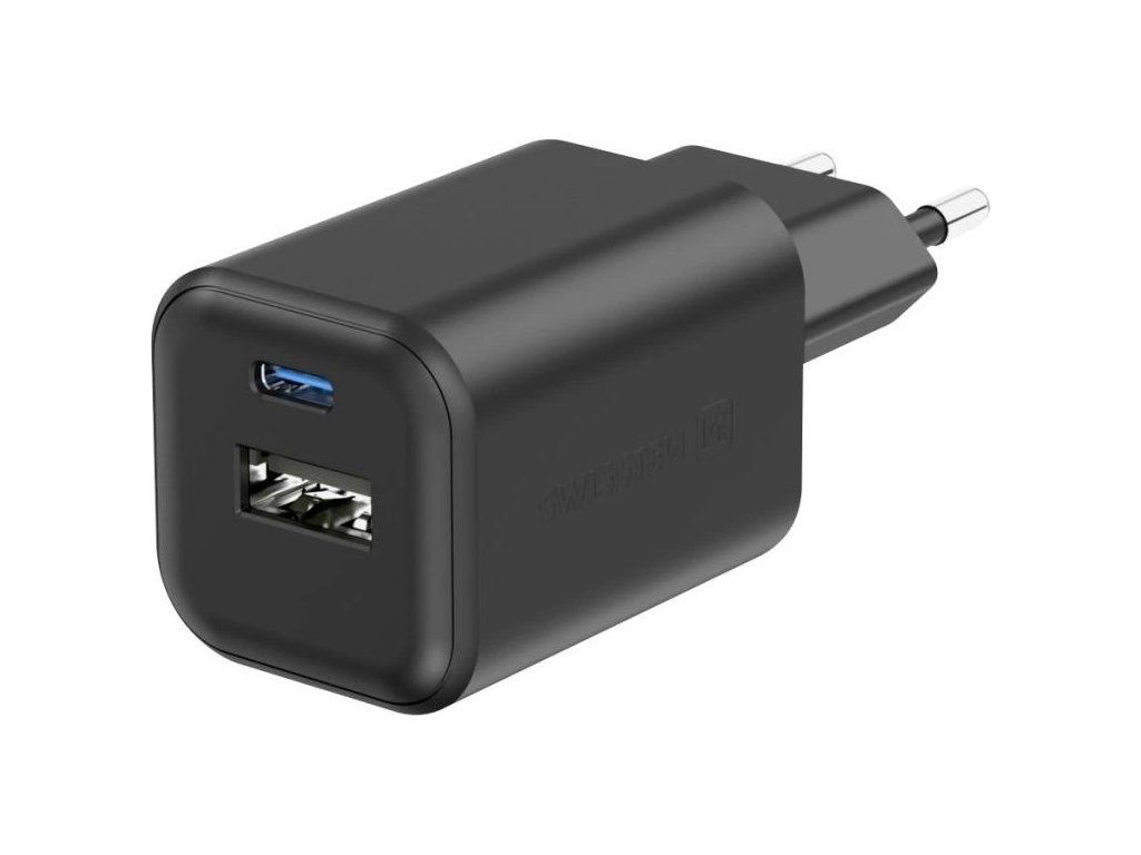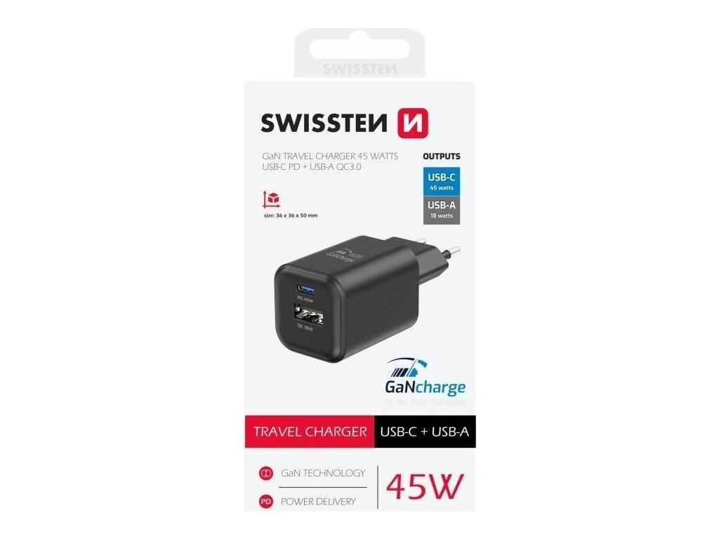 Swissten síťový adaptér gan 1x usb-c 45w pd + 1x usb-a 18w qc černý