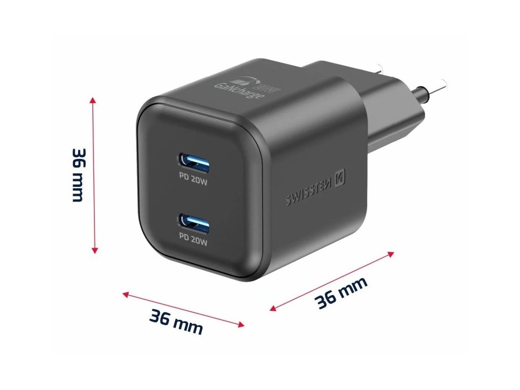 SWISSTEN GaN 2× USB-C PD 20 WUniverzální napájecí adaptér s výkonem až 20 W. Pro nabíjení zařízení jsou k dispozici dva USB-C konektory. Adaptér podporuje protokol rychlého nabíjení Power Delivery. Použitá GaN technologie snižuje tvorbu tepla, čímž zvyšuje účinnost nabíječky při zachování kompaktních rozměrů (přibližně 3,6 × 3,6 × 3,6 cm). Samozřejmostí je ochrana proti zkratování, přepětí, přetížení nabíjení a vysoké teplotě.