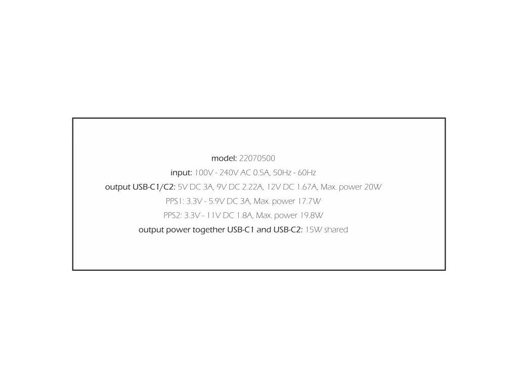 2× USB-C PD: DC 5V/3A; 9V/2,22A; 12V/1,67A