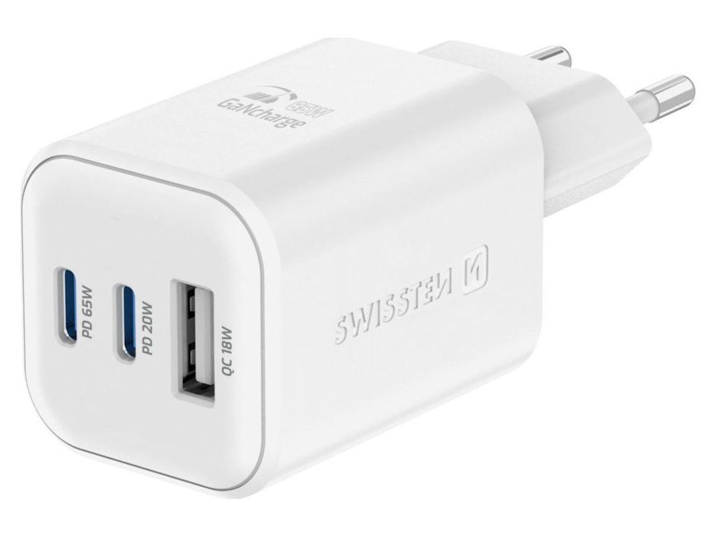Swissten síťový adaptér gan 2x usb-c 65w pd + 1x usb-a 18w qc bílý