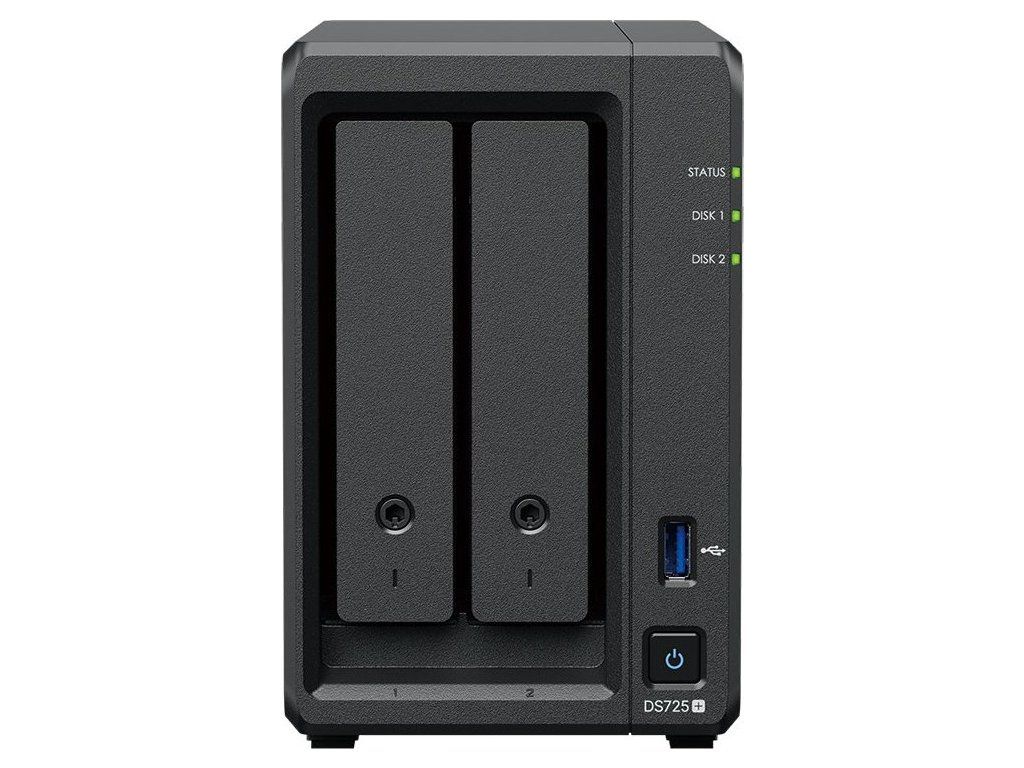 DS725+ nabízí dvě šachty pro 3,5" SATA HDD nebo 2,5" SATA SSD disky s možností výměny za provozu. Navíc obsahuje dva sloty M.2 2280 pro NVMe SSD, které lze využít jako rychlou mezipaměť pro zlepšení výkonu při práci s často používanými daty.