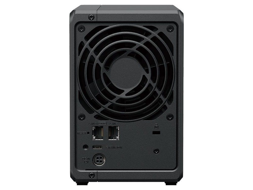 NAS disponuje dvěma šachtami pro 3,5" SATA HDD nebo 2,5" SATA SSD disky a dvěma sloty M.2 NVMe SSD pro rychlou mezipaměť. Připojení k síti zajišťují porty 2.5GbE a 1GbE, které umožňují rychlý přenos dat. Díky možnosti rozšíření pomocí jednotky DX525 lze kapacitu úložiště navýšit až na 7 disků.