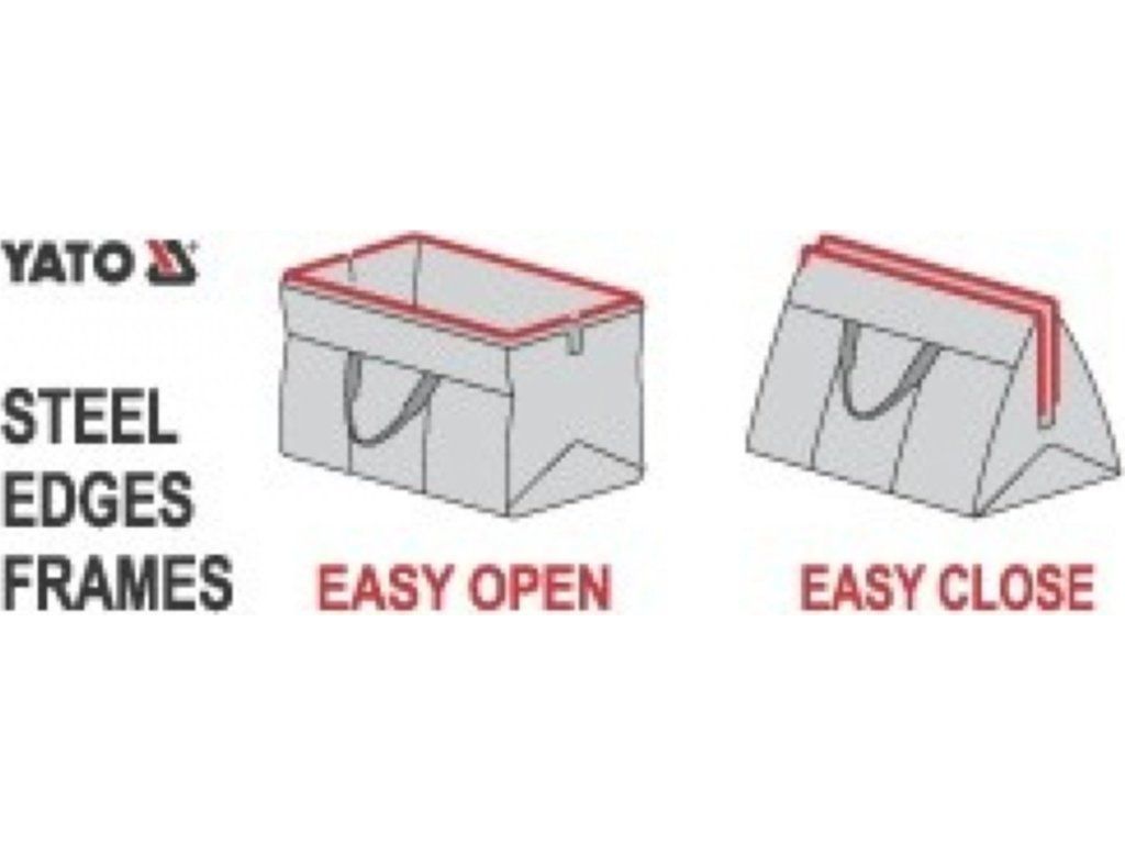 Praktická taška na nářadí YATO vyrobená z vylepšeného nylonu, vyztužená kovovou svorkou se závěsy pro snadné otevírání a zavírání.