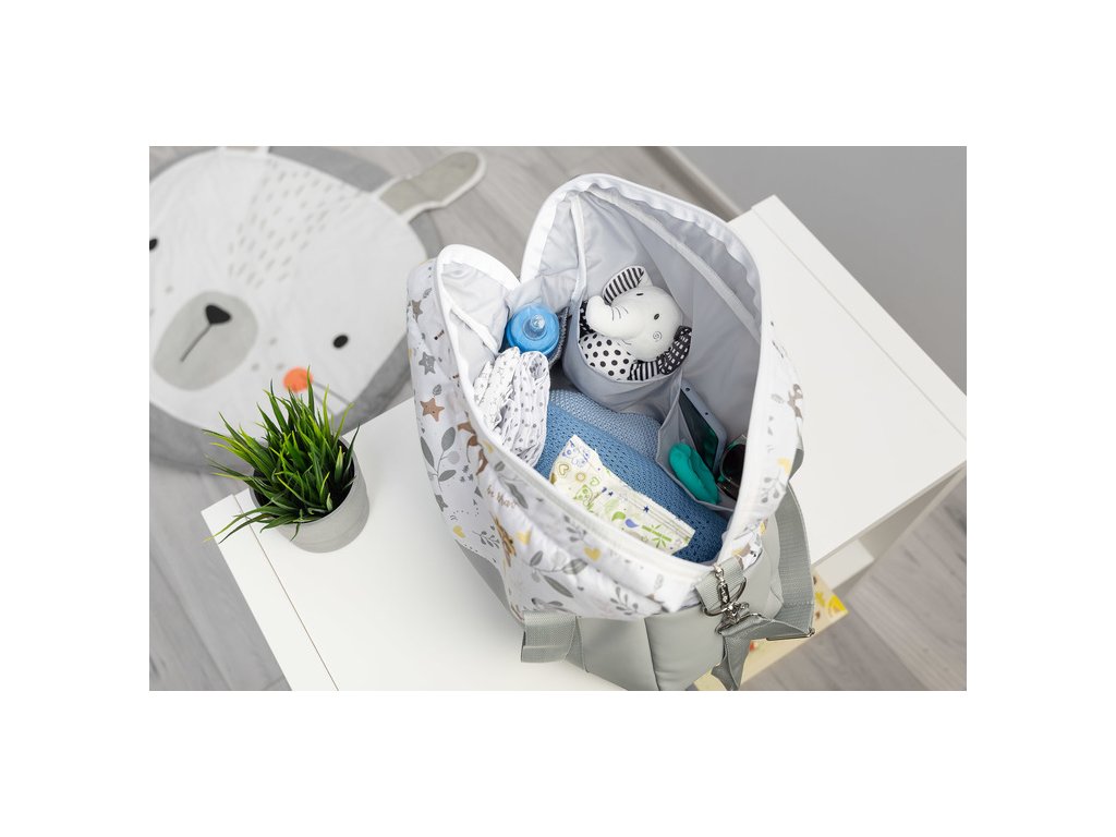 Taška z ekokůže se skvěle hodí nejen do kočárku. Má mnoho výhod, jako jsou: dno z ekokůže, vnitřní kapsy, funkční přihrádky a podšívka odolná proti nečistotám. Na druhou stranu barevná potištěná bavlna dělá tašku vhodnou do moderních kočárků. Taška je navíc vybavena kovovým kováním, univerzálními háčky pro zavěšení na rám a praktickým ramenním popruhem. K dispozici bude v 5 provedeních.