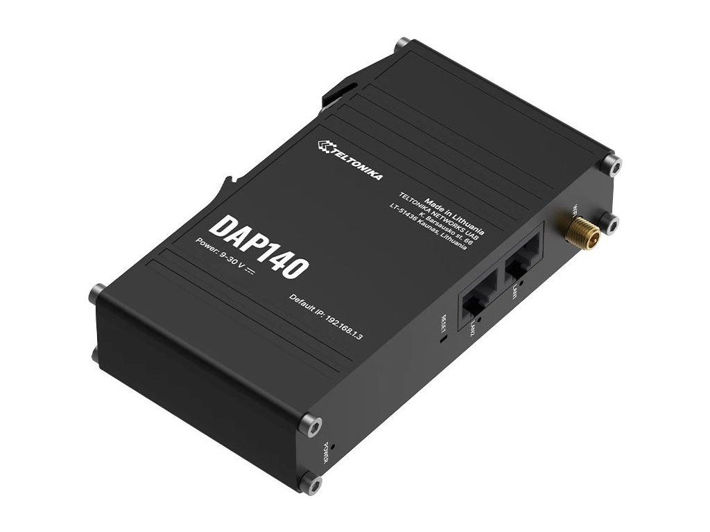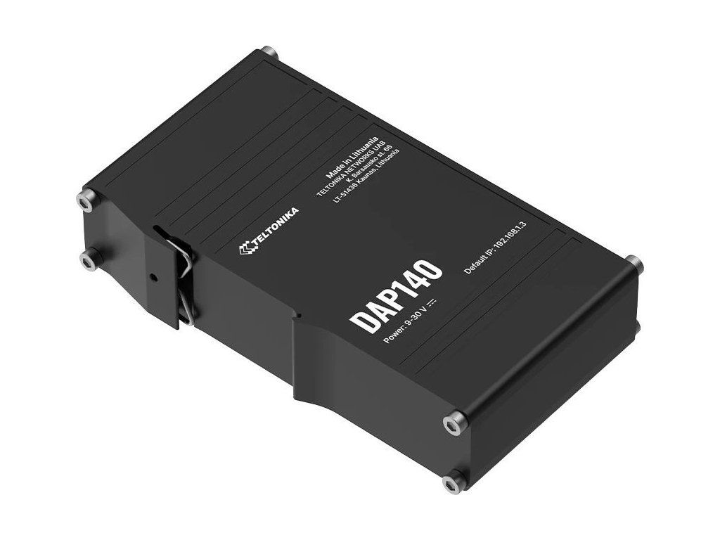 Teltonika DAP140Průmyslový bezdrátový přístupový bod s podporou pasivního PoE napájení, navržený pro náročné průmyslové prostředí. Podporuje Wi-Fi 4 (802.11 b/g/n) s pokročilými funkcemi jako Wi-Fi mesh (802.11s), Fast Roaming (802.11r), BSS Transition Management (802.11v) a dalšími.