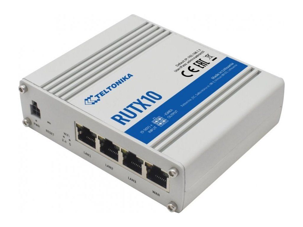 Teltonika RUTX10Výkonný a spolehlivý průmyslový router s Wi-Fi, který podporuje standard 802.11ac. Router pracuje v duálním pásmu 2,4 a 5 GHz a je vybaven Bluetooth LE (low energy) modulem. Představuje ideální řešení pro aplikace v malých kancelářích nebo ve veřejném sektoru, které vyžadují vysokorychlostní přenos dat a nízkou latenci.