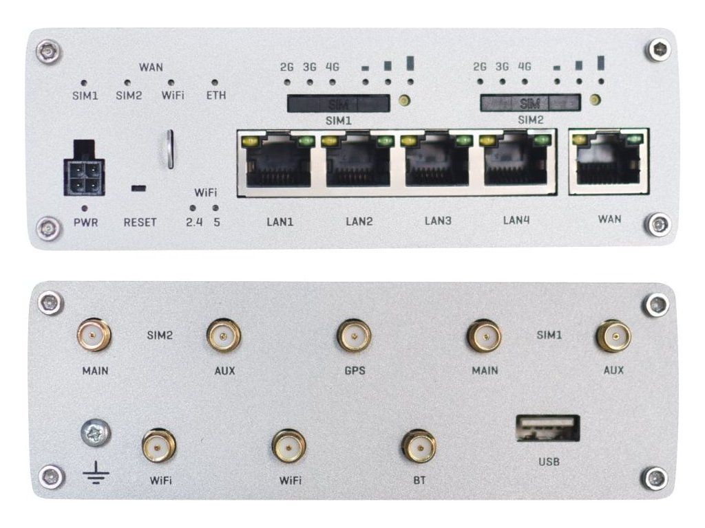 Porty: 5x RJ-45, 1x USB 2.0, 1x digitální vstup, 1x digitální výstup (na napájecím konektoru), 2x SIM slot (Mini SIM - 2FF), 4x SMA (LTE), 1x SMA (GNNS), 2x RP-SMA (Wi-Fi), 1x RP-SMA (Bluetooth)