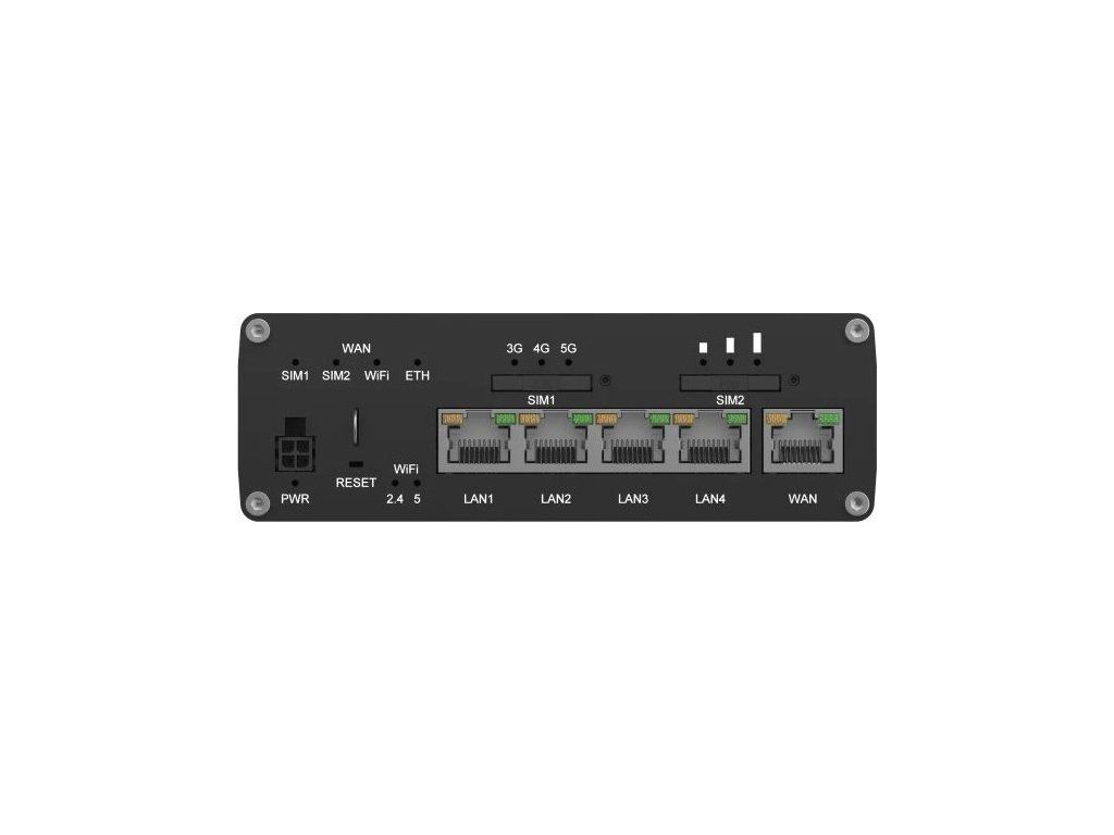 Porty: 5× RJ-45 (1× WAN, 4× LAN), 2× SIM slot (mini SIM, formát 2FF), 1× USB, 1× DI, 1× DO