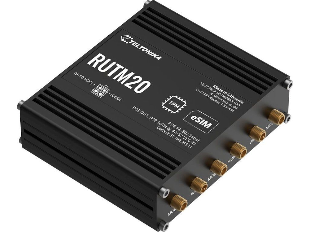 RUTM20 je ultra-kompaktní průmyslový 5G router navržený pro IoT a IIoT řešení, kde záleží na velikosti a nákladech. Využívá globální Telit 5G modem podporující 5G Sub-6GHz SA/NSA s rychlostmi až 2,5/3,4 Gbps DL (4×4 MIMO) a 900/550 Mbps UL (2×2), LTE Cat 19 (1,6 Gbps DL) a 3G (42 Mbps DL). Router je vybaven 2× fyzickými SIM sloty (Mini SIM 2FF) a 1× eSIM s podporou až 7 profilů, což umožňuje vzdálené přepínání operátorů bez nutnosti fyzického zásahu.