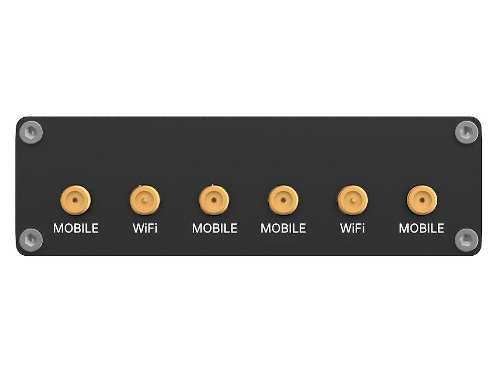 Anténní konektory: 4× SMA (mobilní), 2× RP-SMA (Wi-Fi)