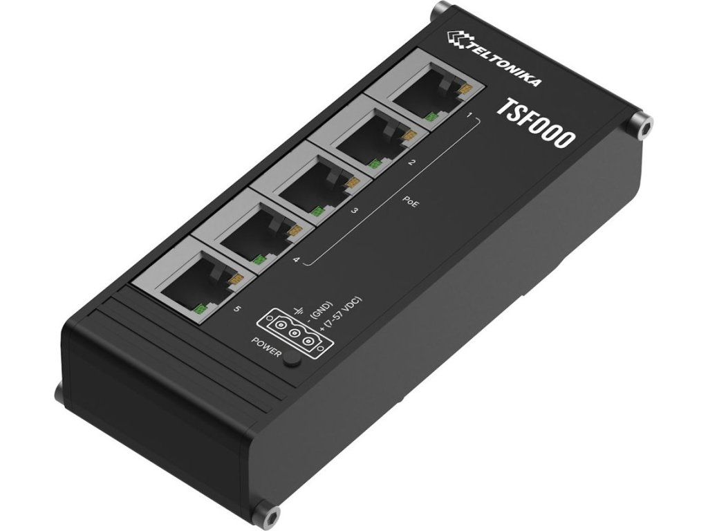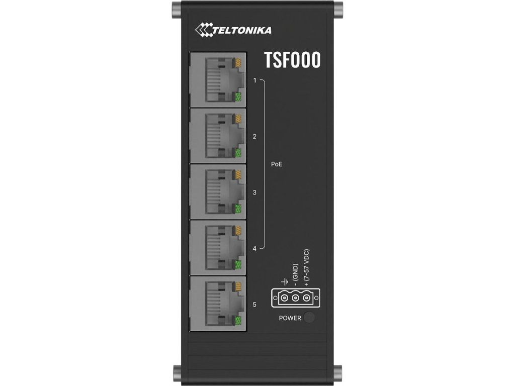 Switch TSF000 nabízí 5 Ethernet portů s rychlostí 10/100 Mbps a podporou automatického MDI/MDIX crossoveru. Čtyři porty jsou vybaveny technologií PoE+ (IEEE 802.3at) s celkovým výkonovým rozpočtem 120 W a maximálním výkonem 30 W na port, což umožňuje současné napájení a datové připojení až čtyř koncových zařízení jako jsou IP kamery, access pointy nebo průmyslové senzory.