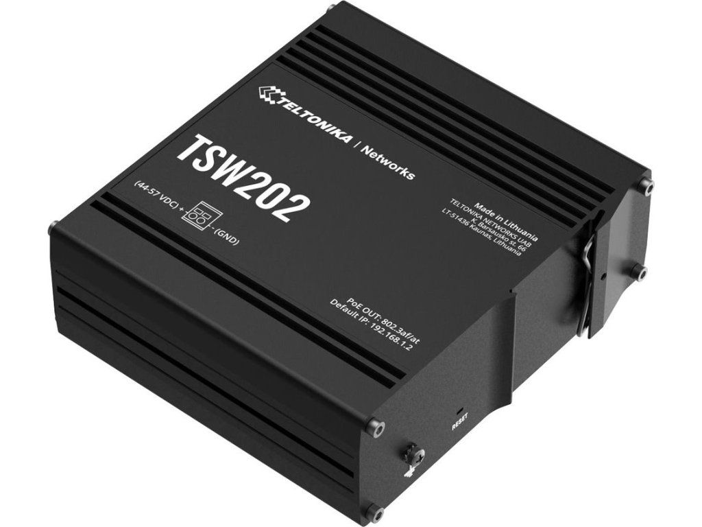 Teltonika TSW202Průmyslový gigabitový L2+ switch s managementem nabízející osm RJ-45 PoE+ portů a dva SFP porty. Celkový PoE budget činí 240 W (max. 30 W na port). K dispozici jsou vybrané L3 funkce, jako statické směrování IPv4 a IPv6 nebo DHCPv6 klient. Podporuje také širokou škálu průmyslových protokolů, včetně EtherNet/IP, Profinet a MRP. Switch má vestavěný držák na DIN lištu.