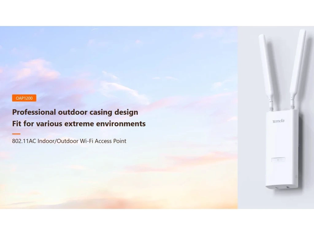 Tenda OAP1200 je bezdrátový Wi-Fi přístupový bod (Access Point) pro venkovní i vnitřní použití, podporuje standardy 802.11ac(wave2)/a/b/g/n v pásmu 2,4 a 5 GHz s rychlostí až 1167 Mb/s s technologií MU-MIMO, OFDMA, Beamforming. Podporuje rychlý přechod klientů Fast roaming 802.11 k/v/r. Obsahuje 1x Gigabitový LAN port, který podporuje aktivní PoE 802.3af napájení ale také pasivní napájení (24V 0,5A). Podpora 12x SSID (8x 2,4 GHz + 4x 5GHz), VLAND tagging, AP Isolation a další technologie, připojení až 256 klientů. Obsahuje držák pro umístění na stěnu, strop, sloup apod.