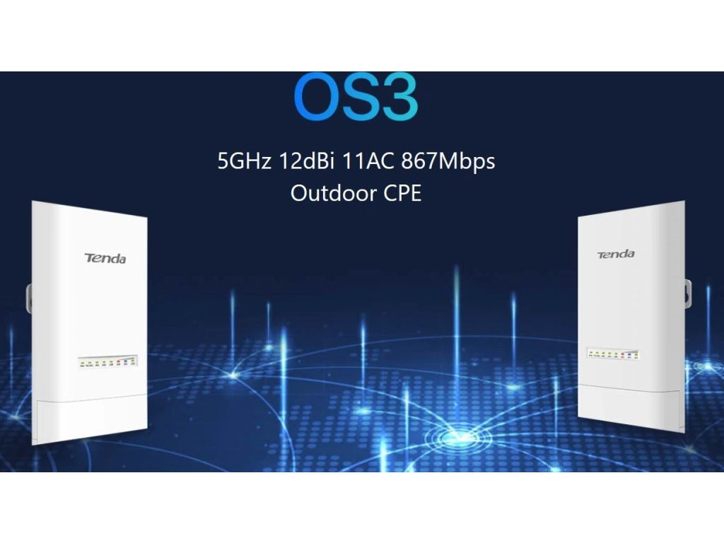 Tenda OS3 je bezdrátová venkovní Wi-Fi CPE jednotka s podporou mnoha režimů AP / Station / WISP / P2MP / WDS Repeater / Router, podporuje standard 802.11a/n/ac v pásmu 5 GHz s rychlostí až 867 Mb/s. Obsahuje 4x LAN port 10/100 Mbps, podporuje pasivní PoE napájení nebo napájecí adaptér (napájecí výhybka i adaptér jsou součástí balení). VPN Pass-Through, SSID Isolation, DDNS, DHCP, Transparent Bridge, VLAN tagging SSID, a další technologie.