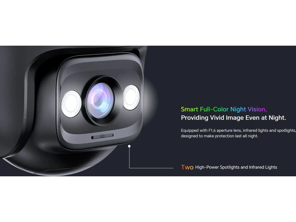 Venkovní otočná IP kamera s rozlišením 3 MPx (2304 x 1296px) a přenosem zvuku, úhel záběru 355° horizontálně a 90° vertikálně, noční vidění s dosvitem 30 m, detekce pohybu, osoby a vozidla, automatické otáčení za pohybem, vestavěný mikrofon, vestavěný reproduktor a siréna, cloud platforma, slot pro microSD kartu max. 512 GB, krytí IP65, připojení pomocí WiFi 6 nebo Ethernet portu RJ45, aplikace pro Android a iOS v češtině. Podporuje Amazon Alexa, kódování H.265, ONVIF.