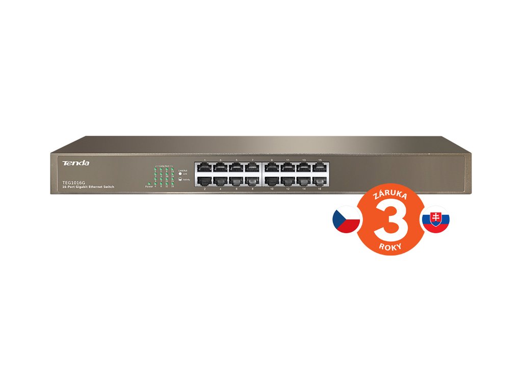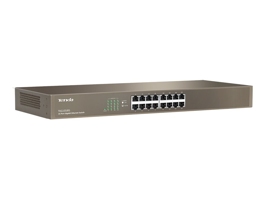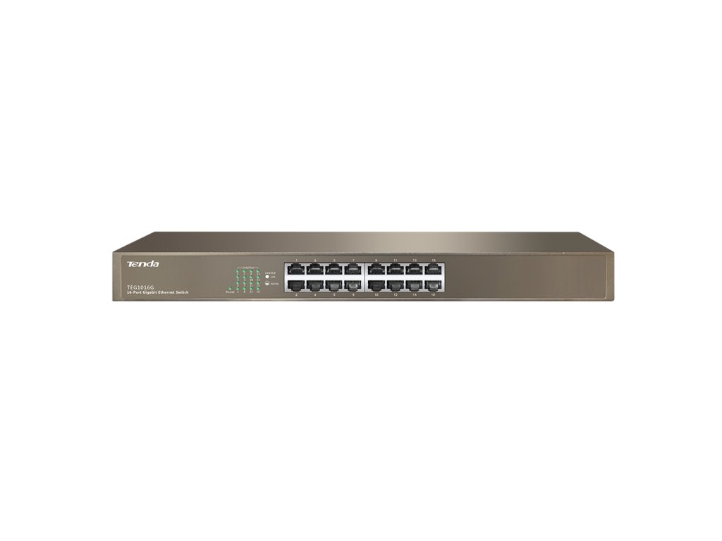Gigabitový 16ti portový switch TEG1016G výrobce Tenda Technology, plně podporuje standardy IEEE 802.3, 802.3u, 802.3x, 802.3ab a je určený pro použití ve firmách i domácnostech.