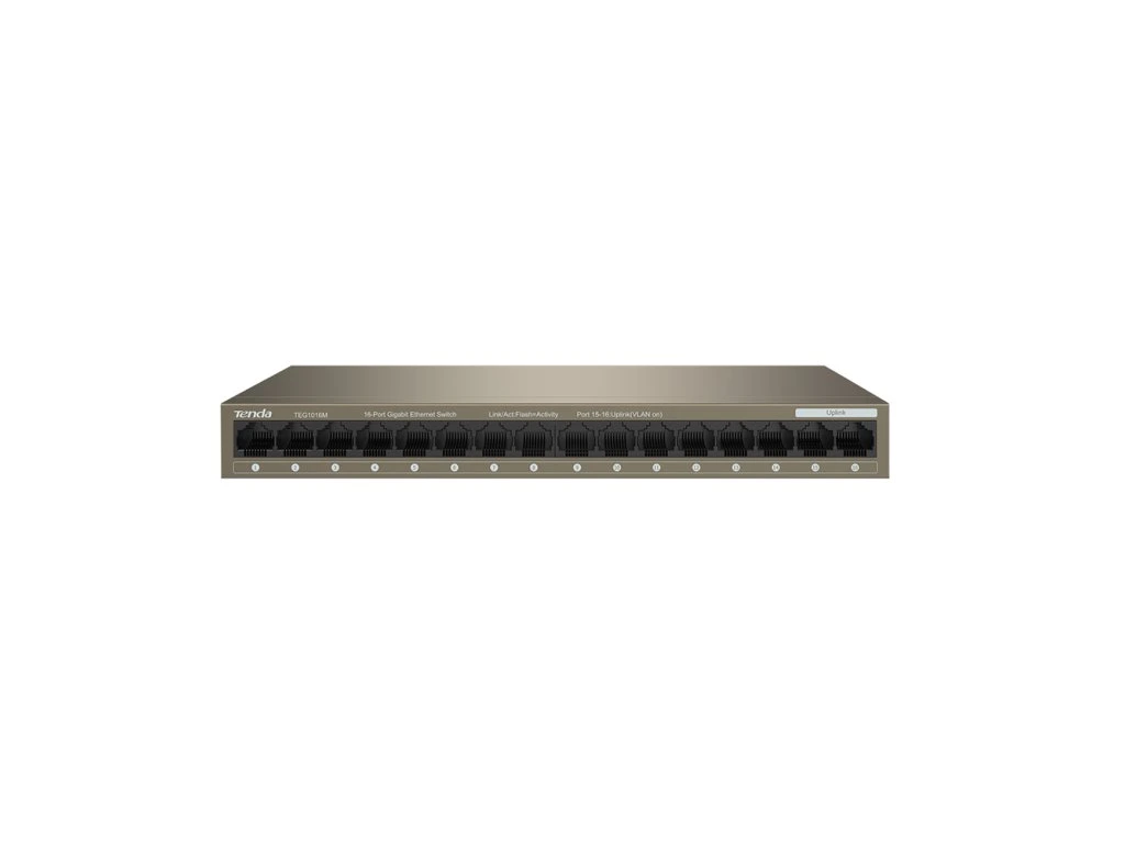 Tenda TEG1016M je 16ti portový gigabitový desktop switch. Auto MDI/MDIX. Propustnost 32Gb/s. MAC address 8K, VLAN, Jumbo Frame 10K, ochrana proti přepětí 6 kV. Kovové provedení. Desktop nebo montáž na zeď. Napájení AC/DC. Fanless, bez ventilátorů.