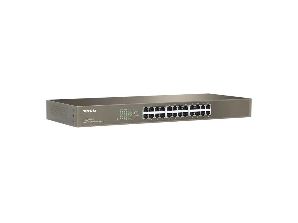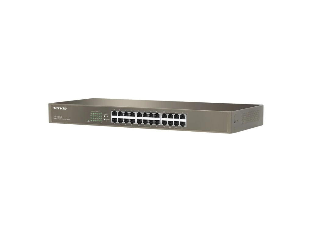 Tenda TEG1024G přepíná data pomocí 24 portů RJ45 s přenosovou rychlostí 10/100/1000 Mb/s s automatickou detekcí rychlosti. Switch disponuje ochranou proti přepětí 6000 V. Podpora přepojování uzlů v módu Store-and-Forward. Full-duplex kontrola toku 802.3x, half-duplex kontrola toku v režimu Back-Pressure. Maximální propustnost 48 Gb/s. Balení obsahuje kovové "L" držáky pro montáž do rozvaděče. Switch je napájen interním zdrojem.