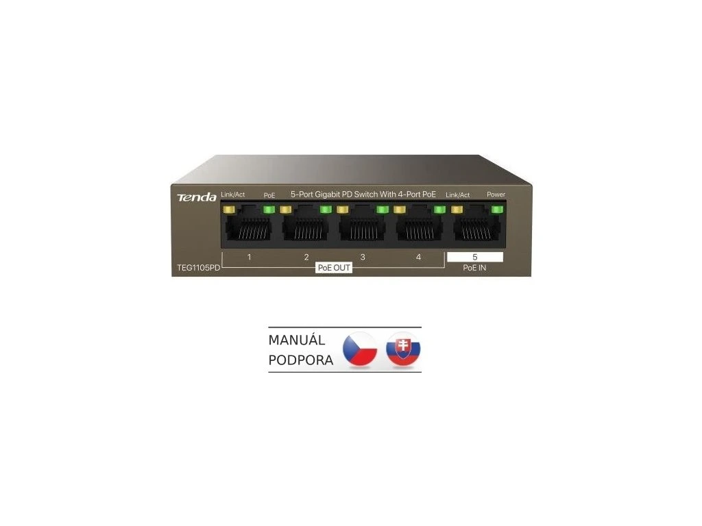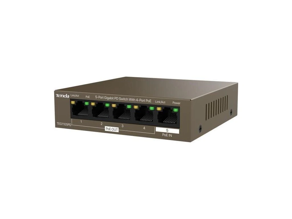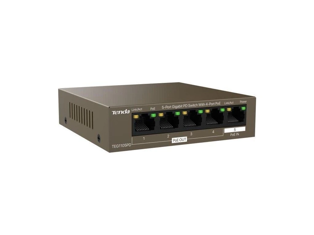 Tenda TEG1105PD je 5ti portový Gigabitový Ethernet PoE switch. Je napájený pomocí PoE a zároveň napájí další zařízení pomocí PoE. 1 port je pro napájení switche a další 4 PoE porty 10/100/1000 Mb/s podporují PoE 802.3af (celkem 4 porty 30 W). Fanless, bez ventilátoru.