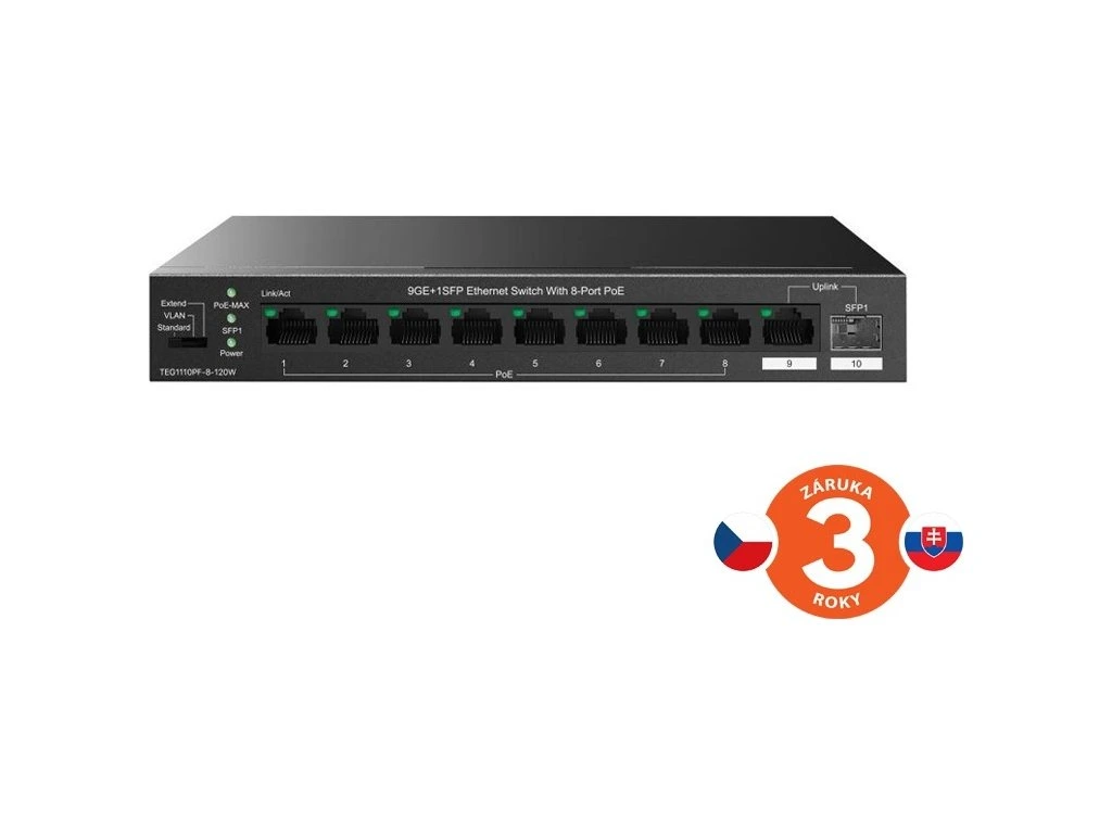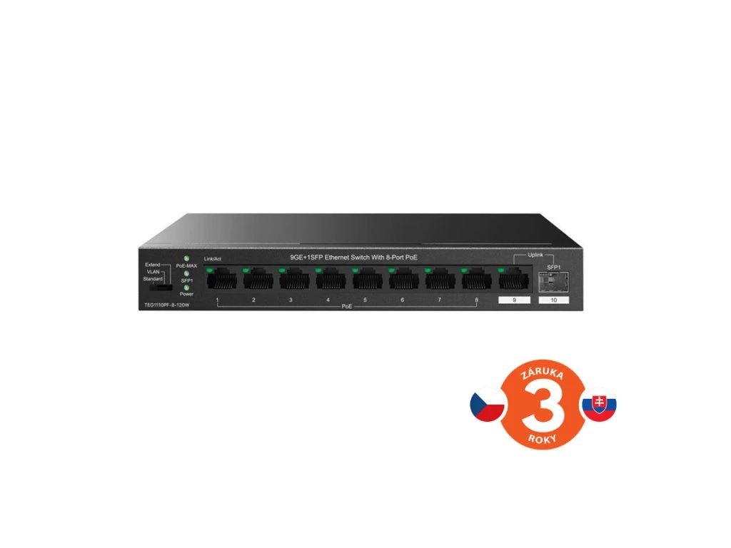 Tenda TEG1110PF-8-120W přepíná data pomocí 9 portů RJ45 a optického SFP slotu. 8 portů 10/100/1000 Mb/s podporuje napájení PoE802.3af/at, další 1 port RJ45 10/100/1000 Mb/s a SFP slot s rychlostí 100/1000 Mb/s jsou určeny pro Uplink. SFP moduly doporučujeme značky Signamax. Switch má ochranu proti přepětí 6kV. Podpora přepojování uzlů v módu Store-and-Forward. Full-duplex kontrola toku 802.3x, half-duplex kontrola toku v režimu Back-Pressure.