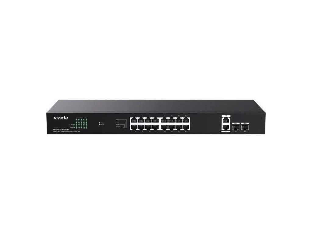 Tenda TEG1120P-16-150W přepíná data pomocí 18ti portů RJ45 a 2x SFP sloty, 16 portů 10/100/1000 Mb/s podporuje PoE802.3af/at. Switch má ochranu proti přepětí 6kV. Podpora přepojování uzlů v módu Store-and-Forward. Full-duplex kontrola toku 802.3x, half-duplex kontrola toku v režimu Back-Pressure.