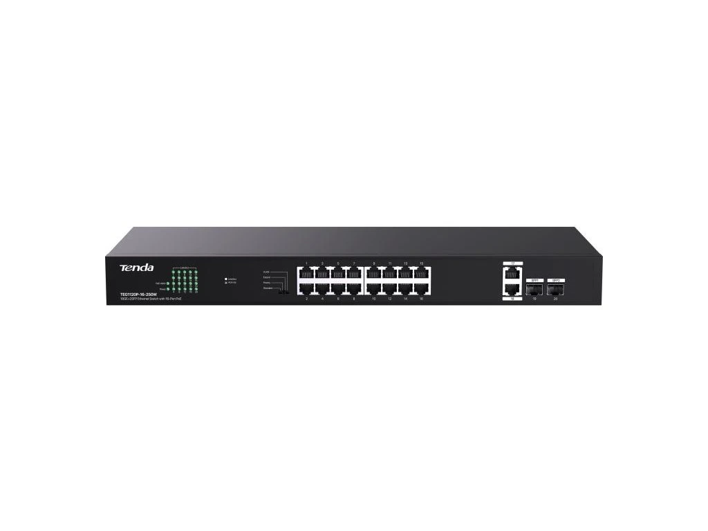 Tenda TEG1120P-16-250W přepíná data pomocí 18ti portů RJ45 a 2x SFP sloty, 16 portů 10/100/1000 Mb/s podporuje PoE802.3af/at. Switch má ochranu proti přepětí 6kV. Podpora přepojování uzlů v módu Store-and-Forward. Full-duplex kontrola toku 802.3x, half-duplex kontrola toku v režimu Back-Pressure.