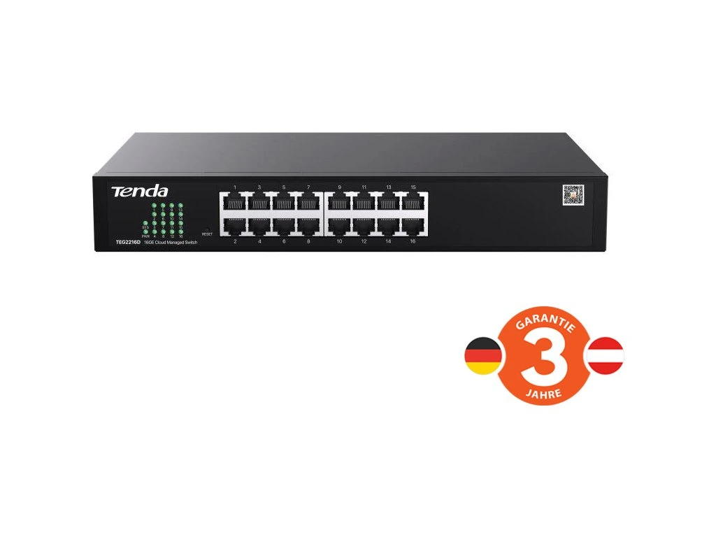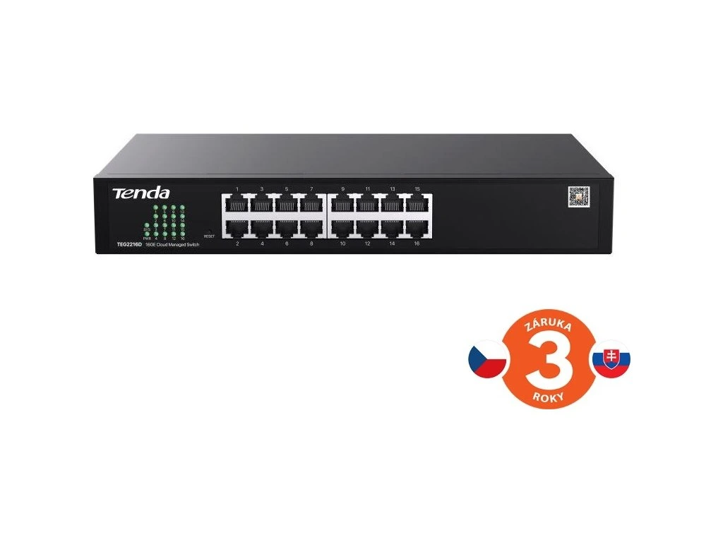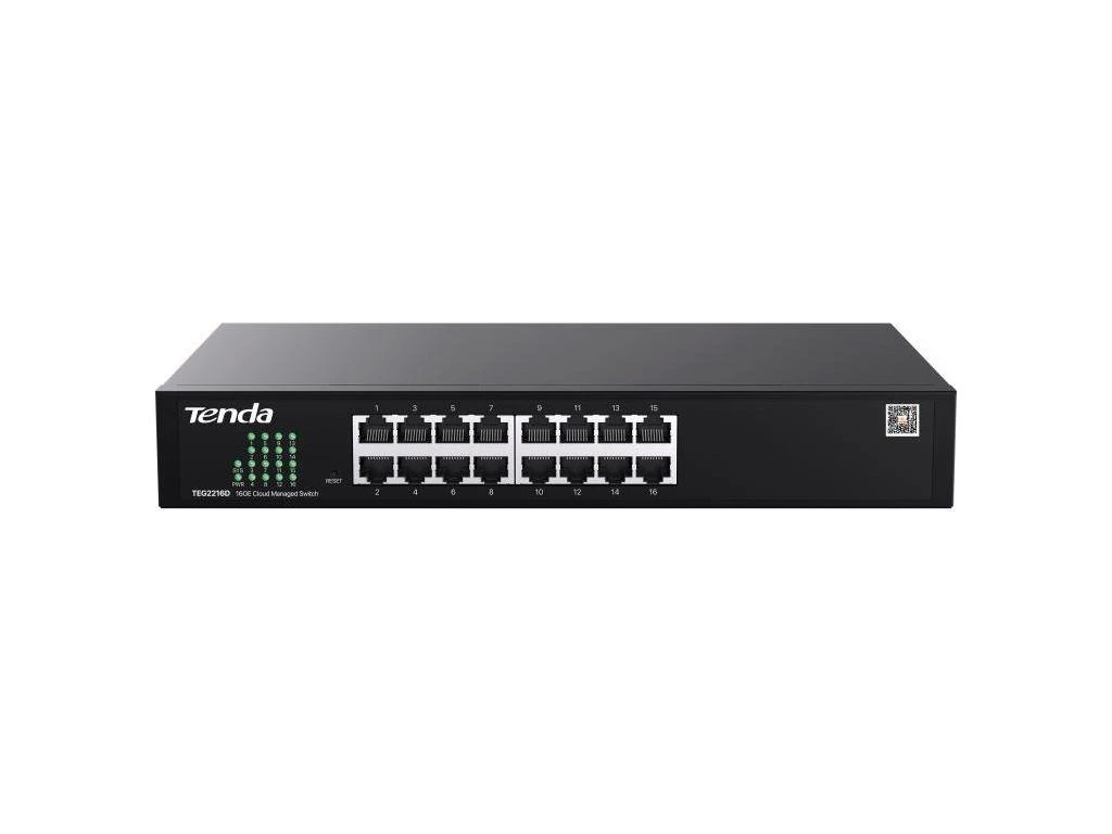 Tenda TEG2216D je 16ti portový Gigabitový L2 Websmart + Cloud switch . 16x 10/100/1000 Mb/s. Podporuje webový + cloud management, QVLAN, IGMP, DHCP snooping, DHCP client, IGMP fast leave, Storm control, Anti-ring, Speed limit, Port mirroring + aggregation. Rackmount.