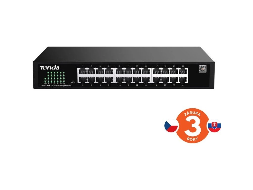 Tenda TEG2224D je 24ti portový Gigabitový L2 Websmart + Cloud switch . 24x 10/100/1000 Mb/s. Podporuje webový + cloud management, QVLAN, IGMP, DHCP snooping, DHCP client, IGMP fast leave, Storm control, Anti-ring, Speed limit, Port mirroring + aggregation. Rackmount,
