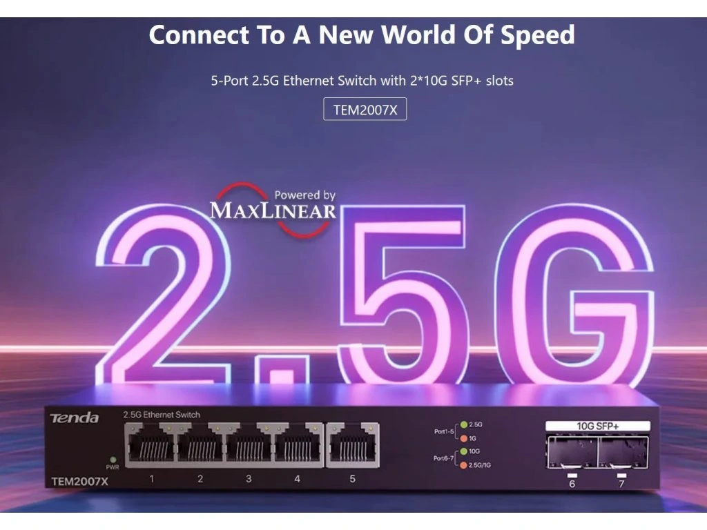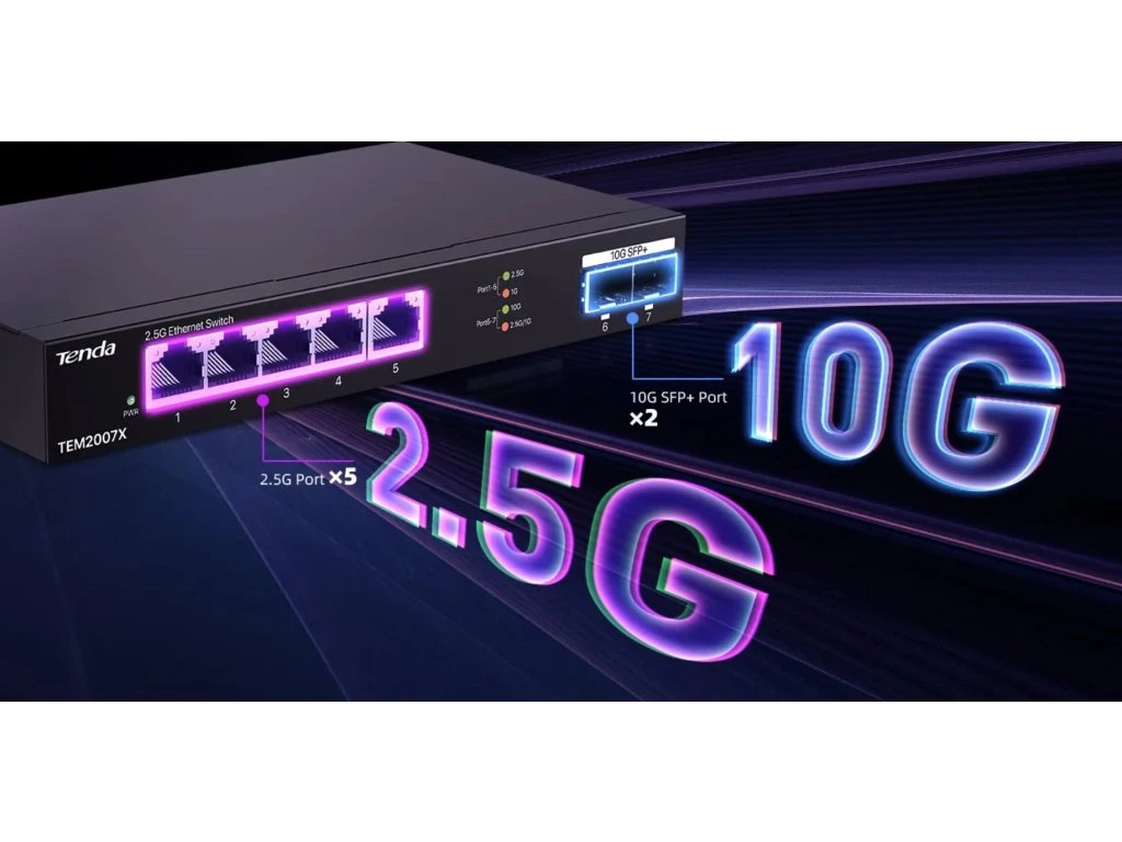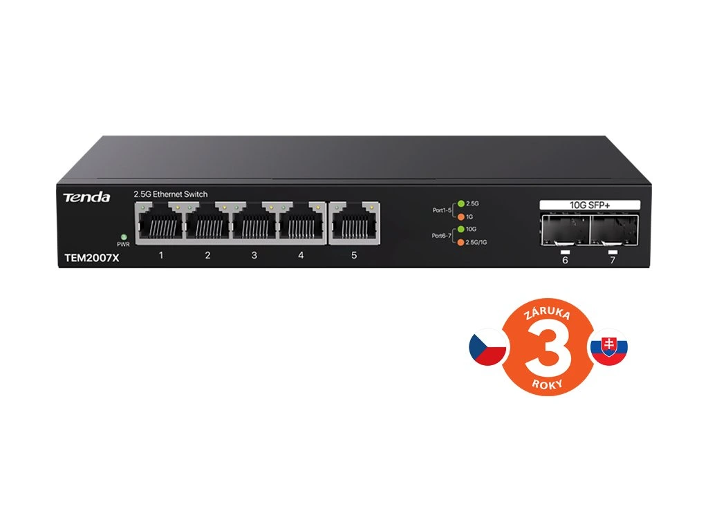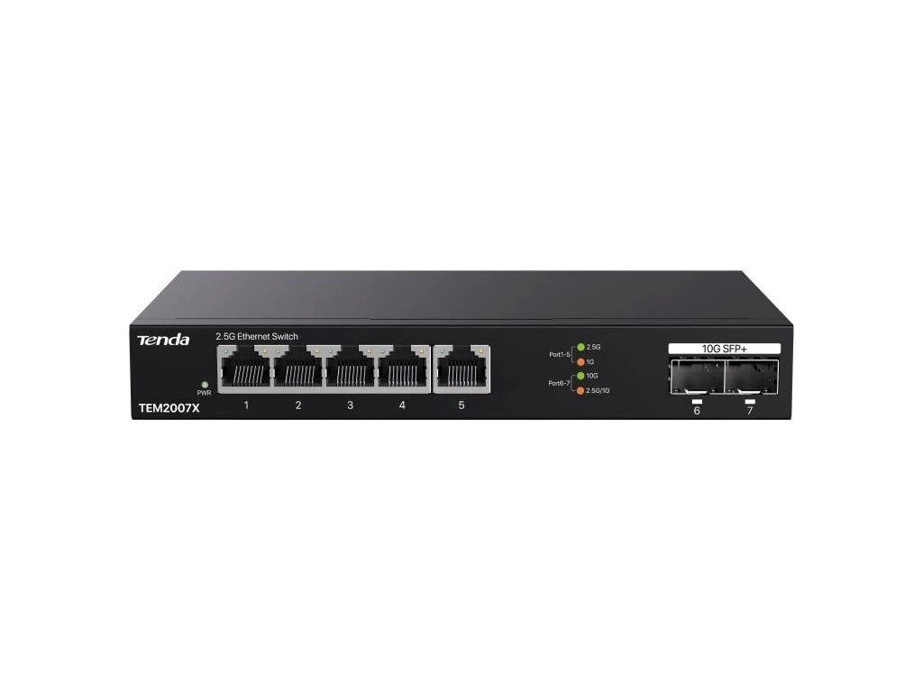 Tenda TEM2007X přepíná data pomocí 5ti portů RJ45 a 2x optického SFP+ slotu. 5 RJ45 portů 100/1000/2500 Mb/s a 2x SFP+ slot s rychlostí 100/1000/10 000 Mb/s. Switch má ochranu proti přepětí 6kV. Podpora přepojování uzlů v módu Store-and-Forward.