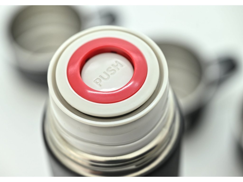 Vrchní část termosky je opatřena těsnícím víčkem s tlačítkem pro snadné nalévání, víčko lze navíc zakrýt jedním ze šálků.
