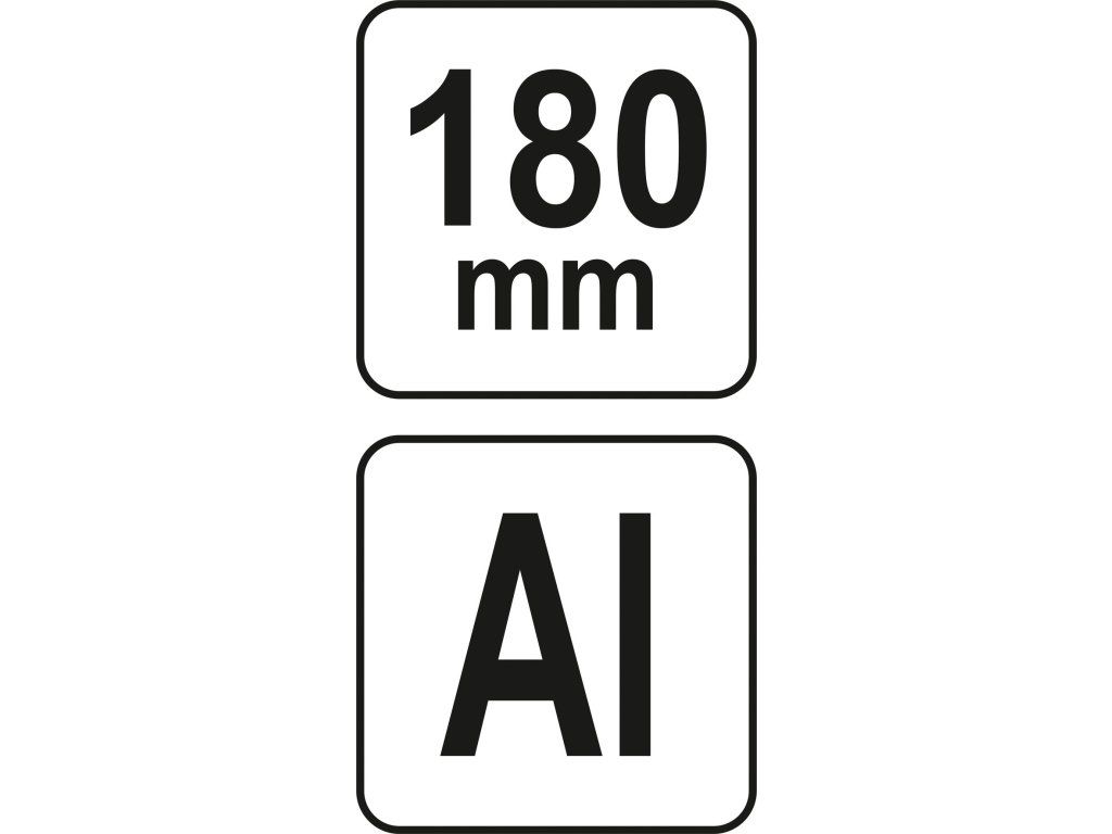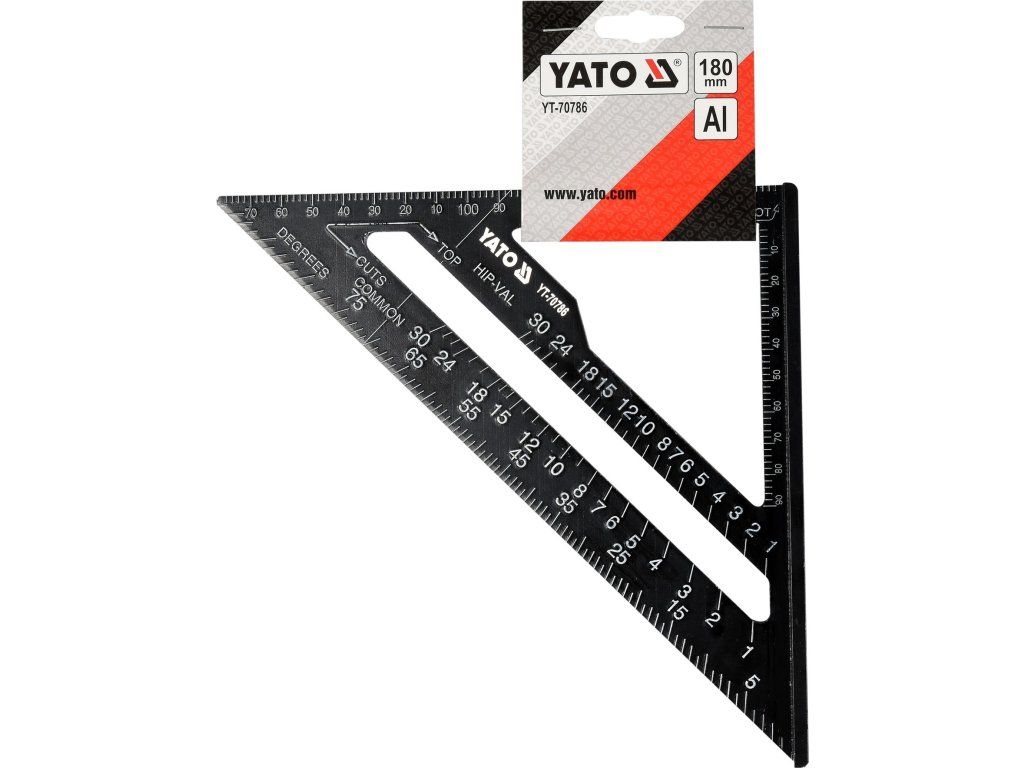 Tesařský hliníkový trojúhelník 180 mm s patkou. Je vyroben z hliníkové slitiny s lakovaným povrchem, trvale nanesená milimetrová i palcová stupnice a specializované úhlové stupnice určené pro měření prováděná při tesařských a pokrývačských pracích.