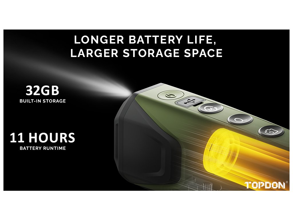 Model TS004 je poháněn výkonnou baterií s kapacitou 5000 mAh, která poskytuje více než 11 hodin provozu. S vestavěným 32GB úložištěm můžete snadno ukládat pořízená videa a fotografie.