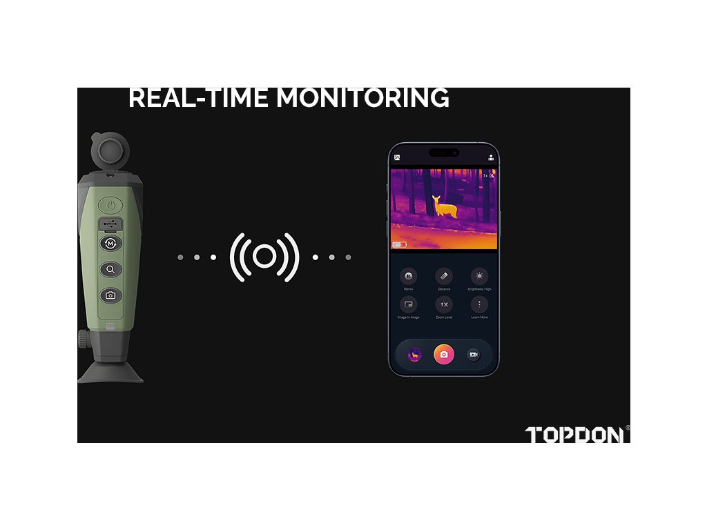 Model TS004 umožňuje bezdrátové připojení k telefonu prostřednictvím aplikace Toplnfrared pro pozorování v reálném čase. Díky ní můžete pořizovat snímky a nahrávat videa se zvukem i bez připojení k internetu.